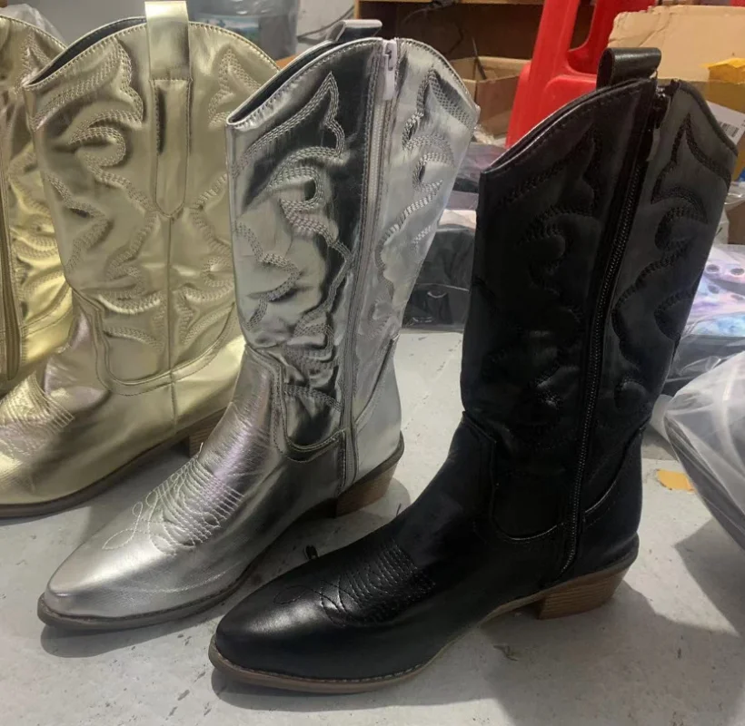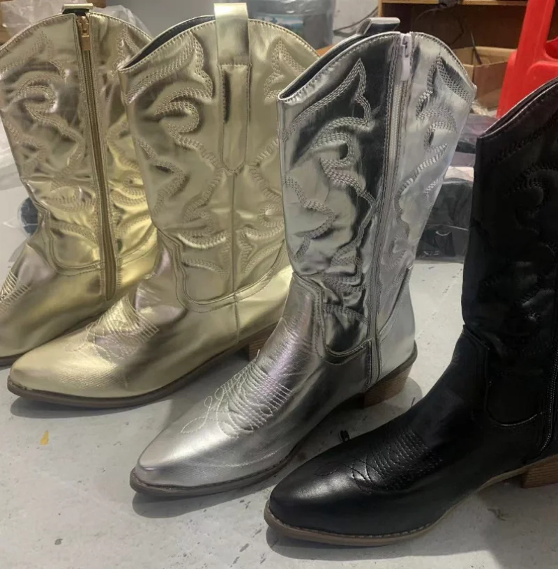 Cowboy Western Boots for Women Shiny Metallic Women's Embroidery Knee High Stiletto Pointed Toe Pink Shoes For Dropshipping