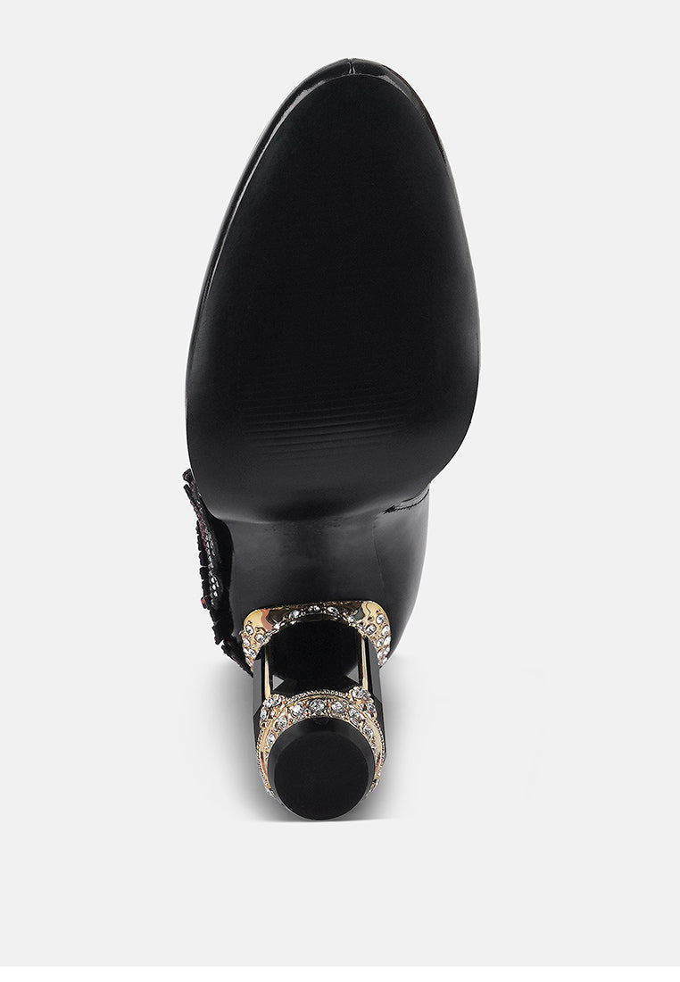 These boots are the epitome of sublime chic with the gorgeous rhinestones embellished patchwork. The embellished jewel fantasy heel accentuates the design with its extravagant touch and gives the boots an opulent look. The high-heeled boots are also quite versatile and a must-have for fashion-forward pupils!