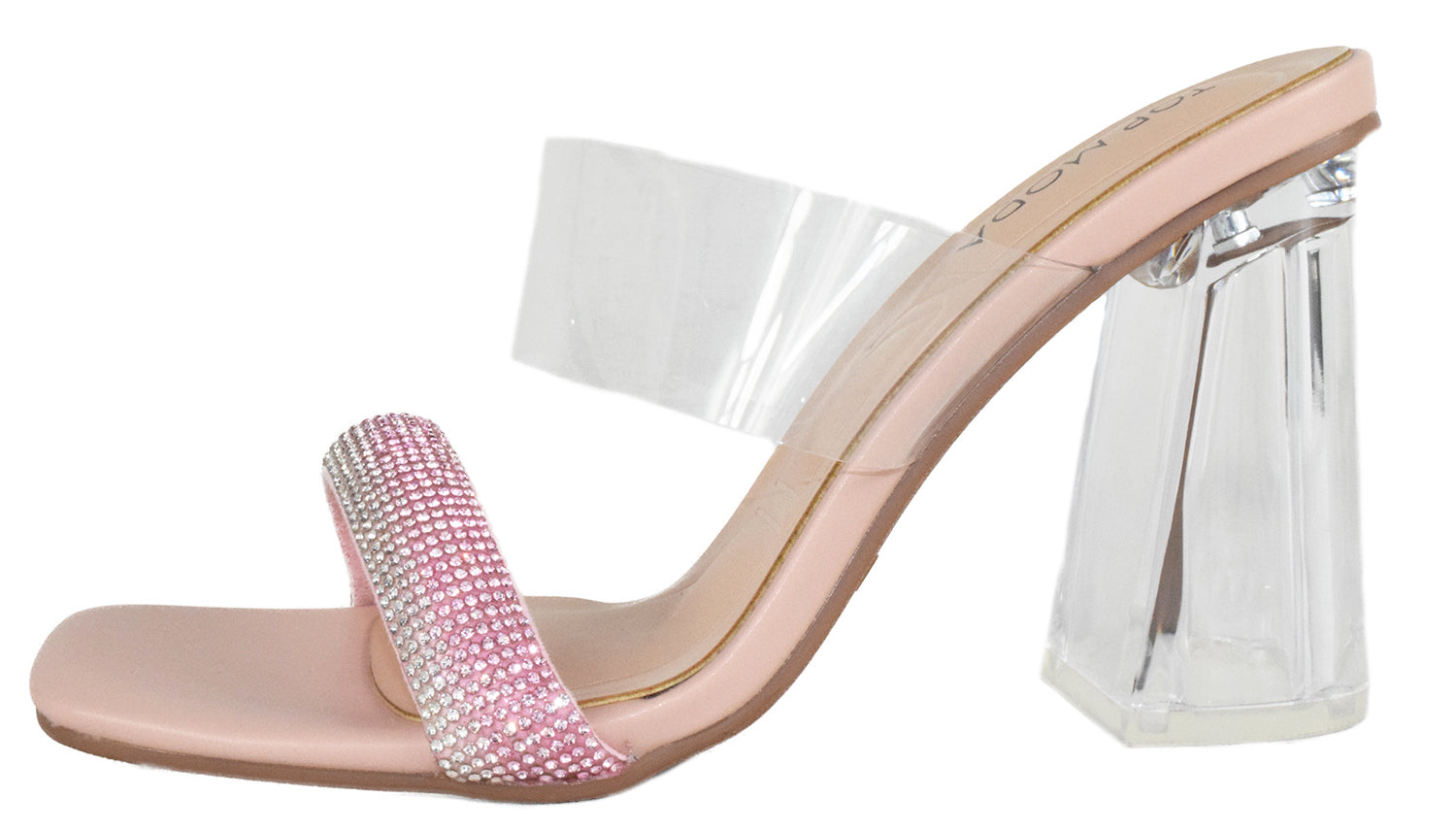 Elevate your shoe game with VENICE-1 From Top MODA. These clear block Mule heels feature a square-toe design accented with a bling rhinestone strap. Perfect for adding some sparkle to any outfit.