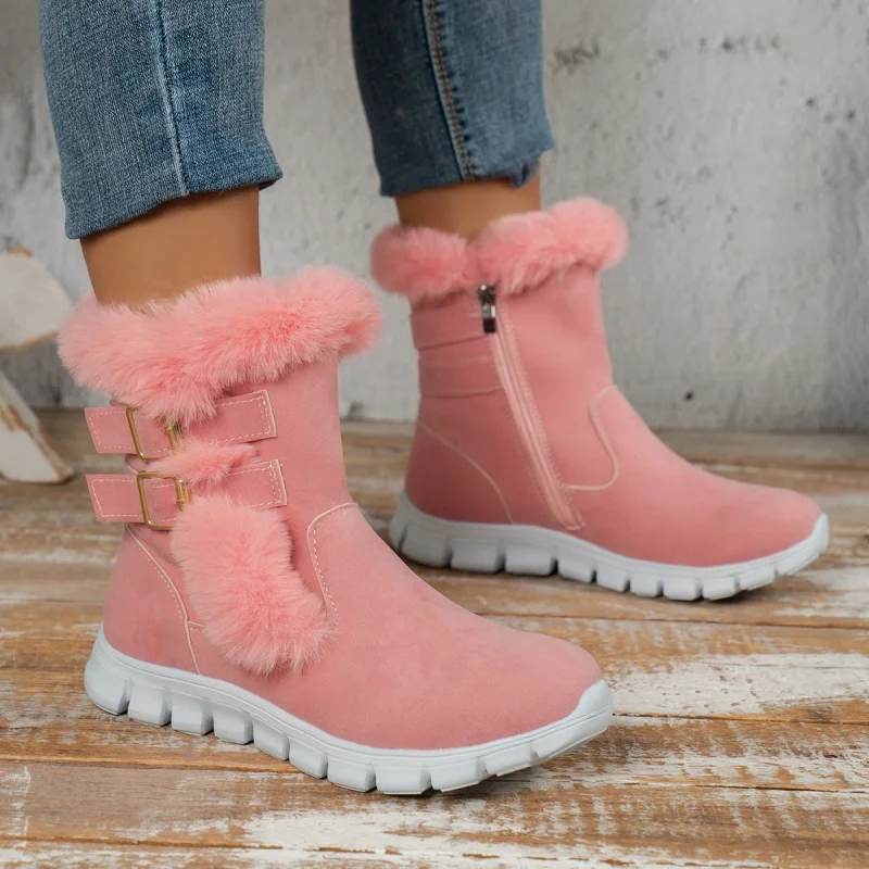 Winter Round Toe Plus Velvet Warm Side Zipper Casual Mid-calf Boots New Comfortable Fashionable Buckle Flat Snow Boots for Women