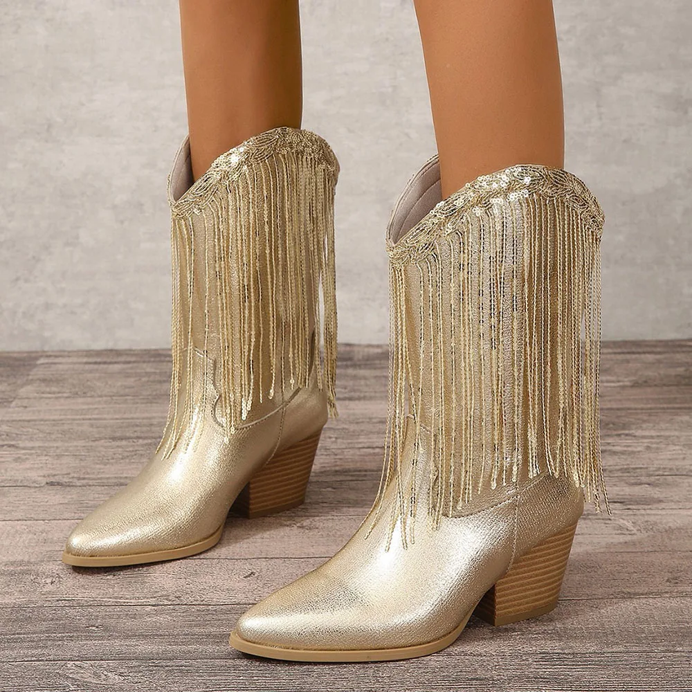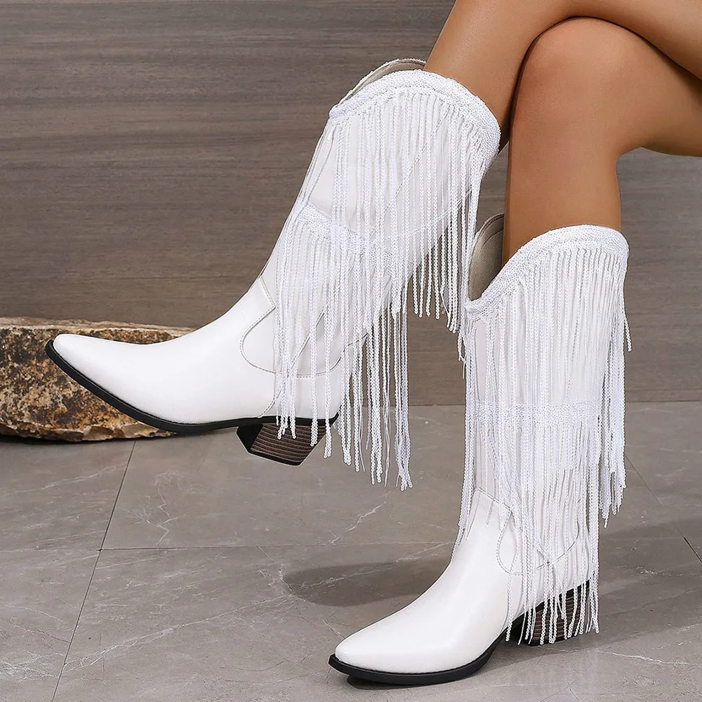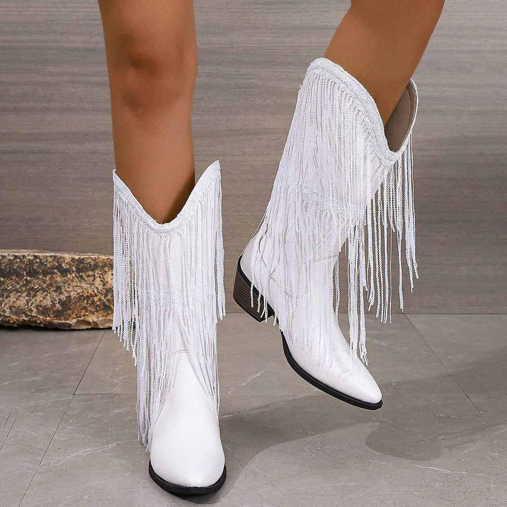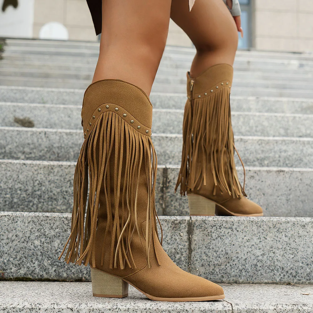 Women's Fringed Cowgirl Boots Concert Western Boot 2025 Spring Summer Vintage Cowboy Boots for Women Pointed Toe Mid-calf Boots